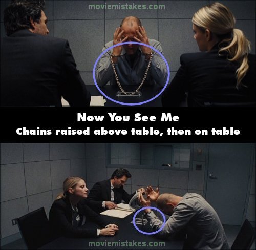 Continuity mistake: When Merritt is explaining to Dylan what mentalism is, he raises his hands and places them on his head, raising both the handcuffs and the handcuff chains with him. From the first angle, the chain has been raised so it is not touching the table, but when he goes to put his hands on his head in the following shot, a piece of the chain, from both handcuffs, is suddenly resting on the table. (00:28:35)