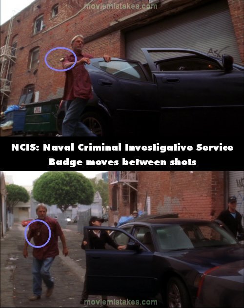 Continuity mistake: When Gibbs arrives at Adam's Blvd, his badge is over his shoulder. Camera cuts and it's down on his chest. (00:20:05)