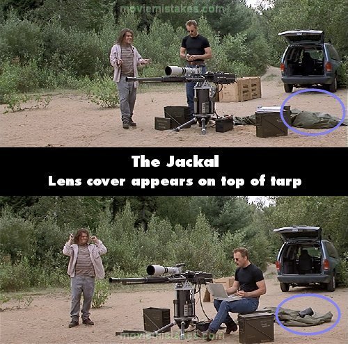 Continuity mistake: After the Jackal takes the tarp off the gun and you see the lens cover sleeve, we then see another shot with the tarp lying on the ground behind the weapon where the Jackal would sit. The lens cover sleeve is not visible anywhere yet. But then a minute later after he's firing the gun up and getting it ready, the shot shows the tarp behind the Jackal, and now the lens cover sleeve is sitting on top of the tarp in clear view. (00:55:40 - 00:57:05)