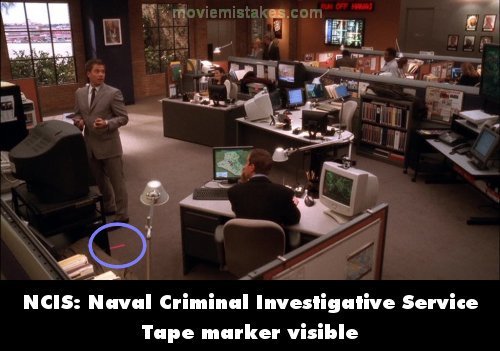 Visible crew/equipment: Near the end, Gibbs walks into the main office to talk to DiNozzo and McGee. When he does a pink tape marker is visible next to Tony. (00:34:30)