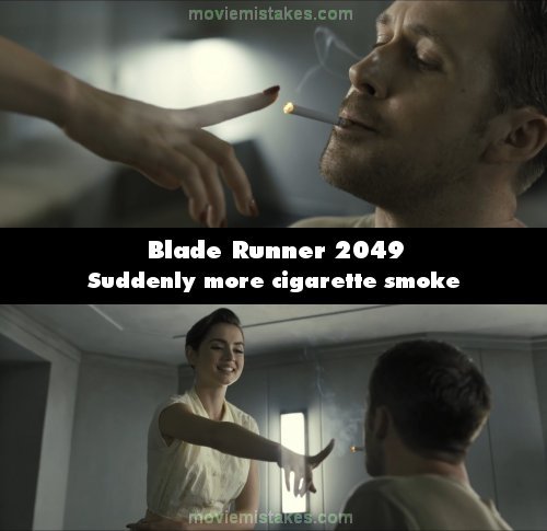 Continuity mistake: When K is at his apartment, Joi lights his cigarette which smokes slightly. The shot cuts to a different angle, and there's much more smoke. (00:18:20)
