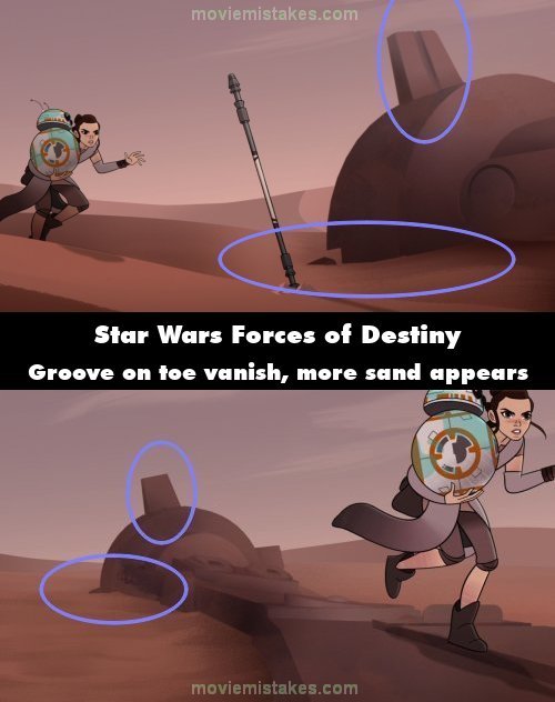 Continuity mistake: As Rey is retrieving her staff with a slimed BB-8 in her grasp, she passes by and leaps onto the leg of an old fallen AT-AT Walker which is next to her. There is a fin, or toe, sticking up into the air from its foot with a groove down the middle in the close shot as she gets her staff. In one of the following shots as she's jumping up onto the leg, that middle groove on the toe disappears. Also in these shots, suddenly much more sand is built up against the foot of the Walker than before. (00:02:00)