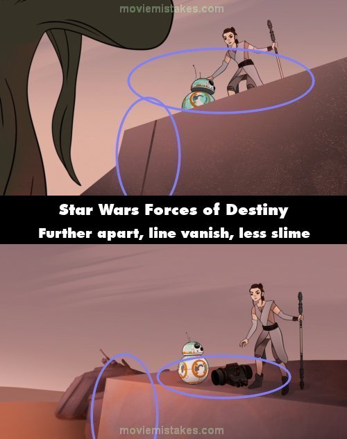 Continuity mistake: Rey grabs BB-8 and her staff, and then jumps up onto a fallen AT-AT Walker. She turns to look at the Nightwatcher worm and is standing right next to a very slime covered BB-8 on top of the AT-AT with her hand on his head. It cuts to a shot of the Nightwatcher from over Rey's shoulder and then back to a frontal view of her again from a higher angle. Rey didn't move once during those shots. But now she's suddenly standing further away from BB-8 to show the junk part between them, BB-8 now has much less slime on him, and the groove in the metal of the walker going down vertically behind BB-8 has vanished. (00:02:05)