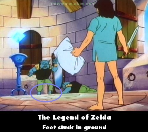 Revealing mistake: After Link grabs his sword and pillow from the air, he lands and turns to face two of the Moblins. When it shows them, the one standing up appears to have its feet stuck in the ground in an odd error in how it's drawn. (00:02:35)