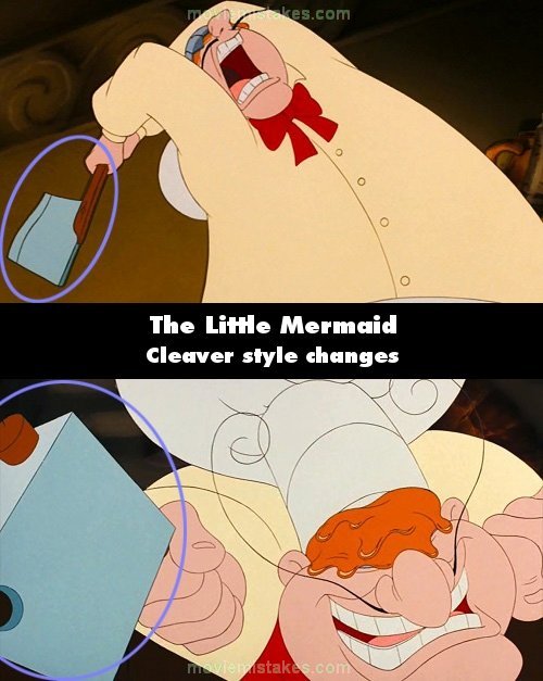 Continuity mistake: After Sebastian knocks over the bowl onto the chef's head, when Louis goes after Sebastian with the cleaver the style of the handle and the blade changes when Louis lifts the cleaver over his head and then chops the table. It happens again when the cleaver blade is rammed into the floor in front Sebastian, and in the next shot as Sebastian turns around the cleaver style has changed again. (00:54:10)