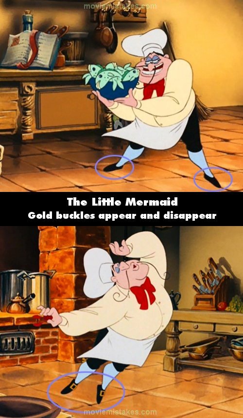 Continuity mistake: While Louis is preparing the stuffed crab and then while he tries to kill Sebastian, the gold buckles on the chef's shoes appear, disappear, and reappear randomly. It happens again at the end, when Louis goes after Sebastian on the ship the gold buckles suddenly appear on the chef's shoes after his teeth are knocked out. (00:52:15)