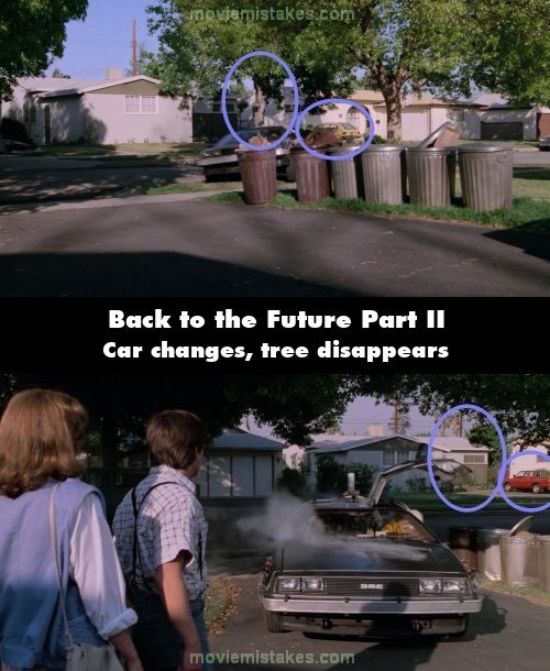 Continuity mistake: At the start, the DeLorean hits the left dustbin and comes to a halt. At the other side of the street, there is only one car parking near to a house. From another angle there's a different red car parking on the other side of the street, and the tree that stood between both houses has gone. (00:01:15)