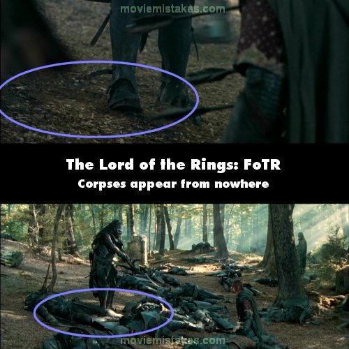 Continuity mistake: At the end of the Amon Hen battle scene, where Boromir has been shot by Lurtz, there is a close-up of Lurtz's feet (as if from Boromir's POV) showing Lurtz striding over and stopping in front of him. The ground is clear all around his feet. The shot then changes to a wide shot, from the side, and there are orc corpses piled up all around. None of these were visible before, but should have been. (01:21:20)