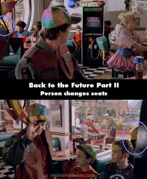 Continuity mistake: In the Café 80's just after you hear Marty say, "It is Wild Gunman", notice the three people sitting in the second booth from the back wall. When the scene changes to Marty throwing his hat on top of the game, you can see that the people have changed tables. You can also see that they are gone again when it shows a close-up of the two kids. (00:15:18)