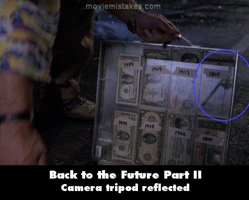 Visible crew/equipment: If you look at the money case that Doc brings with him that has all the different types of money for each year, you will see where it says 1864 the reflection on the glass or plastic of what appears to be a tripod most likely for lighting. (01:03:47)