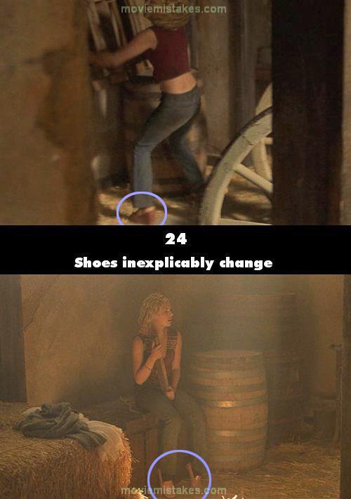 Continuity mistake: In the 08:00 - 09:00 episode on DVD (and during the previous few hours) you see Kim Bauer's feet and she is wearing sandals with no socks. At 08:36 when Terri has just been taken from the room where they are being held captive you see a shot of Kim sitting down and you can see that she is wearing pink leather slipper style shoes and black socks.