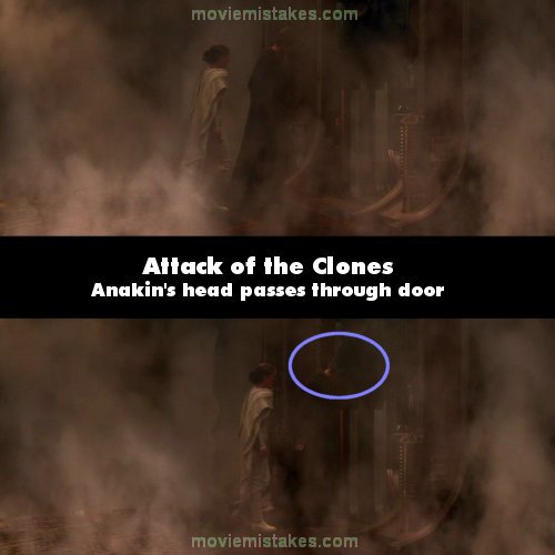 Revealing mistake: When Padme and Anakin enter the droid production centre, there is a shot of them going through a large door. Though they both crouch slightly, Anakin's head passes through the door, revealing it to be CGI. (01:36:35)