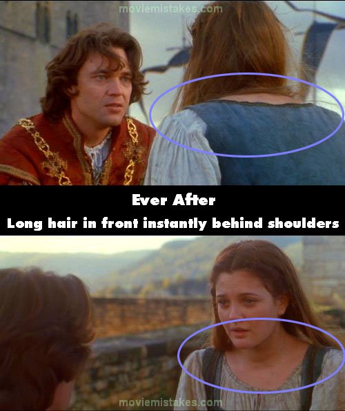 Continuity mistake: When the Prince proposes to Danielle, in the shot from behind her, her long hair is pulled forward in front of her shoulders, but in the shots from the front her hair is behind her shoulders and she did not touch it. (01:47:05)