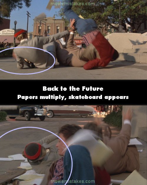 Continuity mistake: In the escape from Biff on the skateboard, Marty collides with a couple near some steps. His skateboard is left at their feet, but after a cut his skateboard's now behind the woman's head in an ideal place for Marty to grab it. The papers thrown in the air suddenly multiply and appear on the ground (under the people, which means they must have dropped the papers first before falling over!). (01:04:15)
