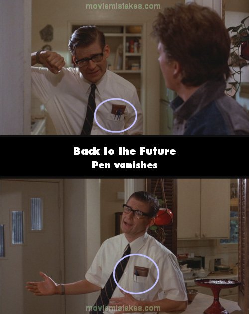 Continuity mistake: At the beginning of the movie after Biff leaves the McFly home. There is a scene where Marty and George are talking. In one shot George has three pens in his pocket, a few seconds later he has two. (00:14:14)