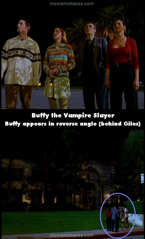 Revealing mistake: After Buffy has entered the wasp-filled school there's a shot of the others standing outside waiting for her. In the establishing long shot if you look closely you can see they used the same shot as earlier in the episode - Buffy is standing there with them. (00:34:10)