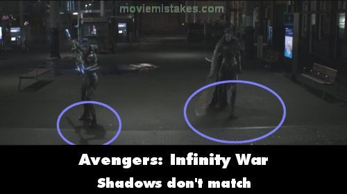 Revealing mistake: Just after Proxima Midnight and Corvus Glaive land in the train station, there is a wide shot where they begin approaching Wanda and Vision. In the wide shot, their shadows do not appear to match up with each other, despite being under the same lighting. Proxima Midnight's shadow is positioned in front of her and is quite heavy, but Corvus Glaive's shadow is positioned more to his left and is much lighter than Proxima's. (00:40:20)
