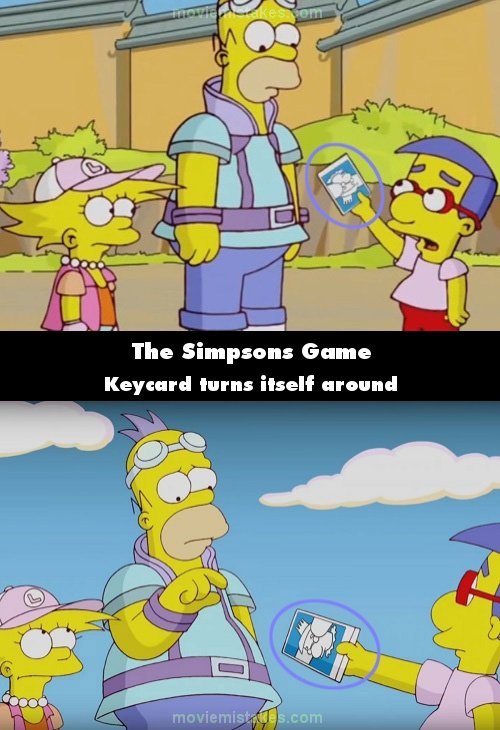 Continuity mistake: Level 14 "Big Super Happy Fun Fun Game" cutscene: When Milhouse hands over the keycard to Homer, he's holding it out upside-down, but in the next shot the keycard is rightside-up while he's still holding it out to Homer, but it's upside-down again when Homer takes it.