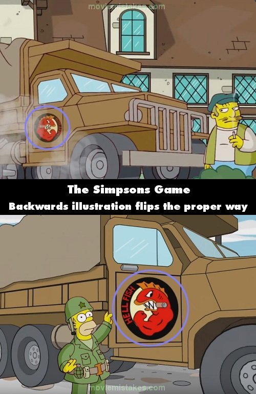 Continuity mistake: Level 13 "Medal of Homer" cutscene: Right before Homer receives the keycard, when the military truck drives into the village, in this shot the "Hellfish" illustration on the door is reversed and "Hellfish" is written backwards, then it's fine in the following shots.