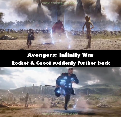 Continuity mistake: When Thor, Rocket and Groot begin charging towards the army after arriving in Wakanda, the shot from behind them shows Rocket and Groot running slightly behind Thor. Then it cuts directly to a shot in front of them, just before Thor jumps into the air, and Rocket and Groot are now further back. (01:45:50)