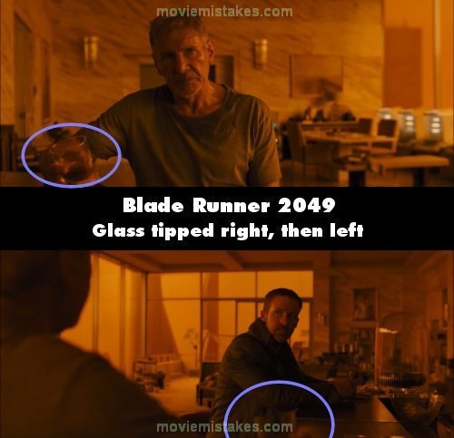 Continuity mistake: When K is asking Deckard about Rachel, just after he asks what was she like, the shot cuts to Deckard where he has his glass tilted to the right. The shot cuts again where the glass is more tilted to the left. (01:53:05)
