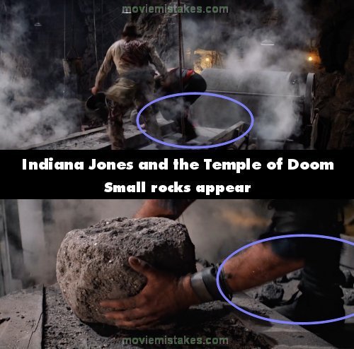 Continuity mistake: When Indy is fighting the Chief Guard on the conveyor belt, there is nothing behind the guard before he picks up the large rock, but in a close-up there are now small rocks on the belt.