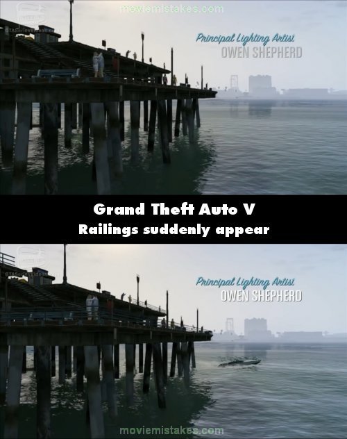 Revealing mistake: In the establishing shots of Los Santos, in the shot of the Del Perro Beach Pier, the railings surrounding it suddenly pop-up onscreen midway through the shot.