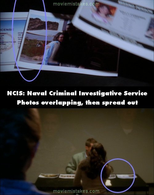 Continuity mistake: Gibbs places pictures down on the interrogation table overlapping each other. When Ken sweeps them away they are all spaced evenly. (00:29:30 - 00:30:30)