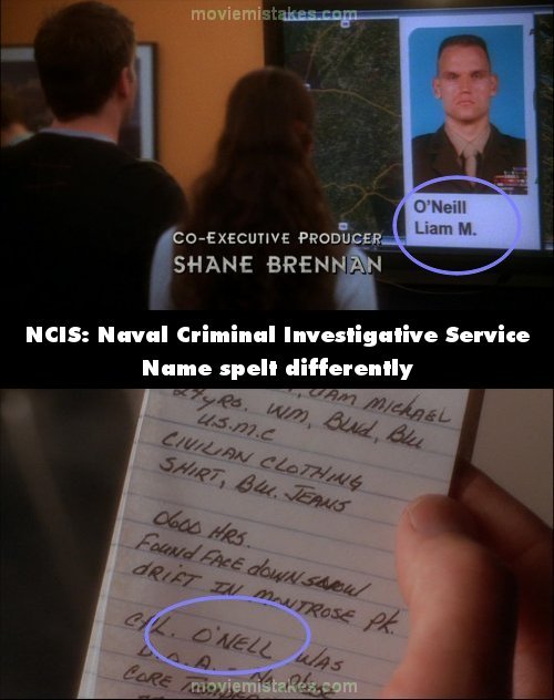 Character mistake: We see Cpl O'Neill's name on the plasma at the start. However when looking at Ducky's notes it's spelt O'Nell. Not a mistake Ducky would make. (00:03:15)