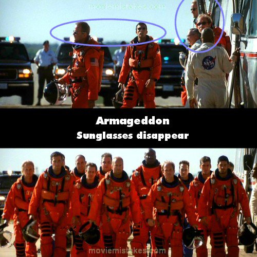 Continuity mistake: When the crews climb onto the buses to travel out to the shuttles, none of them are wearing sunglasses. When they exit the bus those that are seen are wearing sunglasses. However, the following 'slow mo' shot of everyone shows they aren't again. (01:03:00)