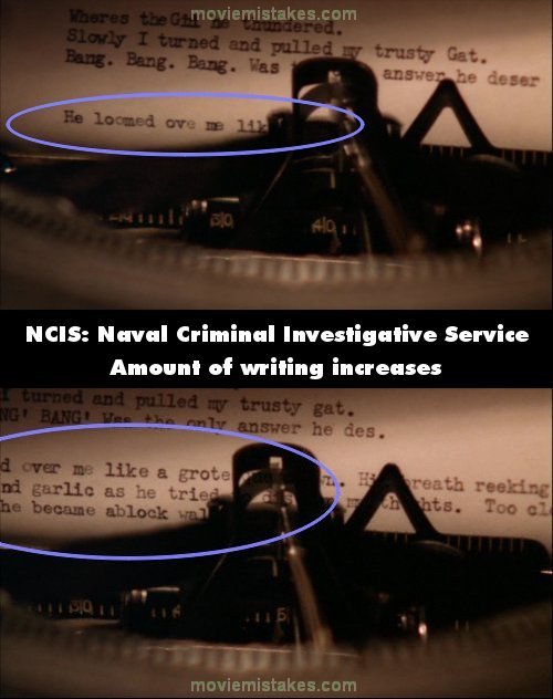 Continuity mistake: When McGee is writing, we see he is working on a new paragraph. Camera cuts away for 6 seconds and then cuts back and now he is already halfway through the third line of that paragraph despite there not being enough time or enough pings of the typewriter resetting. (00:33:50)