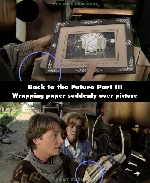 Continuity mistake: When Doc gives Marty the picture of them, Marty opens the package and leaves the wrapping paper behind. A shot later, from a a different angle, the paper is all around the picture.