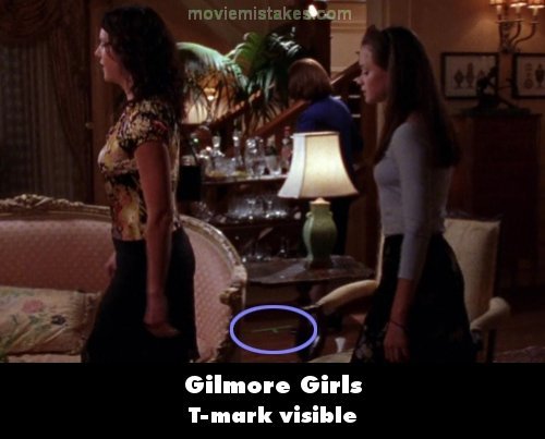 Visible crew/equipment: After Lorelai and Rory meet Emily's new maid, when they walk into the living room the T-mark is visible on the floor where Emily stands. (00:32:05)
