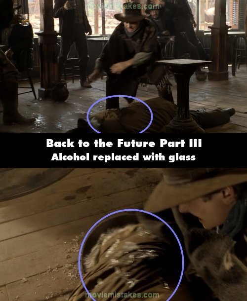 Continuity mistake: When Doc passes out after drinking whiskey, he falls face down against a table and his back gets wet. When the angle changes it's dry and covered with glass.