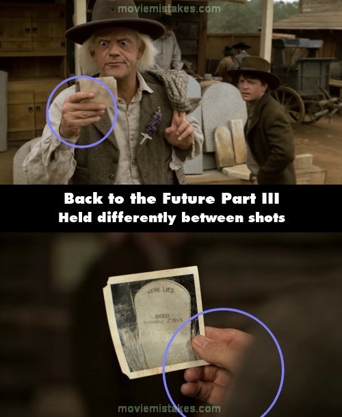Continuity mistake: After Doc meets Clara he and Marty watch a tombstone. Doc grabs the picture and says "my name has vanished!" The way he holds the picture differs between the first and second shot.