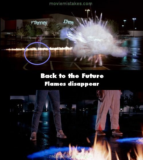 Continuity mistake: After the DeLorean disappears with the dog inside, flames appear underneath Marty and Doc. In the close-up of their legs, a shot later, the road is spotless and the flames reappear a second later.