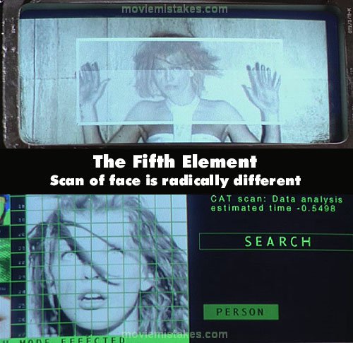 Continuity mistake: When LeeLoo is on the ledge outside of the building, the police corner her & take her picture. Her face is pretty calm, but when the picture is developed on the police screen, she looks shocked. (00:32:20)