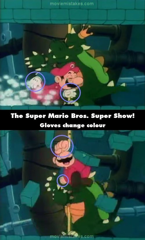 Continuity mistake: This mistake is in the intro with Mario and Luigi in real life. When Mario breaks the ceiling while Bowser is holding a yellow bar, Mario's gloves disappear from his hands when he jumps to break the ceiling. When he lands, his gloves reappear back on his hands. (00:00:26)
