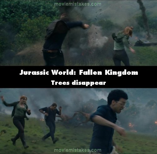 Continuity mistake: When running from the volcano after escaping the Baryonyx, we see the group level with a group of trees. Camera changes to a front view and the trees have gone. (00:40:40)