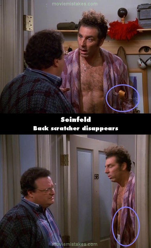 Continuity mistake: Kramer is holding his hands in front of him with a back scratcher in his left hand, and then suddenly after a cut his hands are not up and we don't see him holding a back scratcher. He proceeds to close the door with his left hand, which is now holding nothing. (00:05:25)