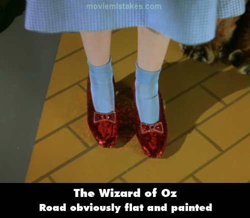 Revealing mistake: When the doorman initially refuses to let Dorothy and friends into the Emerald City, they protest, saying the Good Witch of the North sent her; they show him the ruby slippers as proof. As the camera pans down to the slippers, look at the yellow brick road Dorothy is standing on - it is flat and looks as though it was simply painted.