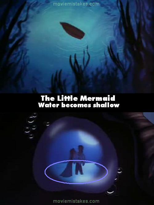 Continuity mistake: During the "Kiss the Girl" song a bunch of fish swim up underneath the boat, and the water is seen to be very deep. After the boat is knocked over however, Ariel and Eric are standing in the water which now appears to be only a few feet deep.