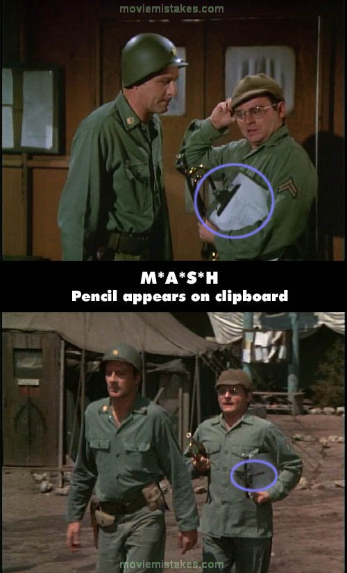 Continuity mistake: When Radar and Burns leave the tent for morning parade, Radar's clipboard acquires a pencil. (00:02:50)