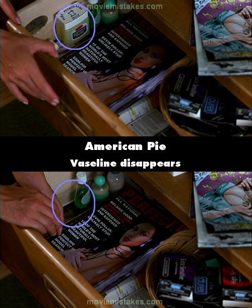 Continuity mistake: When Nadia is going through Jim's drawer in his bedroom, a tub of Vaseline magically disappears from one shot to the next. In the same scene on top of the drawer a small white box appears at the same time the Vaseline disappears. (00:45:18)