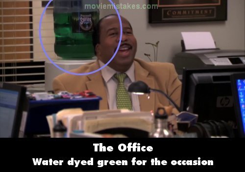 Trivia: The water in the water cooler in this episode is dyed green, and the label says "Pocono Springs." Props to the set design team. (00:01:00)