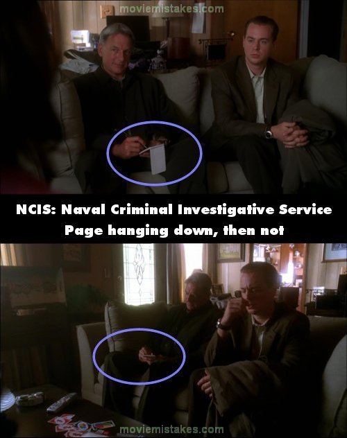 Continuity mistake: When talking to Carson's mum, the notepad Gibbs is holding has 1 page hanging loose or not at all depending on the shot. (00:09:10)