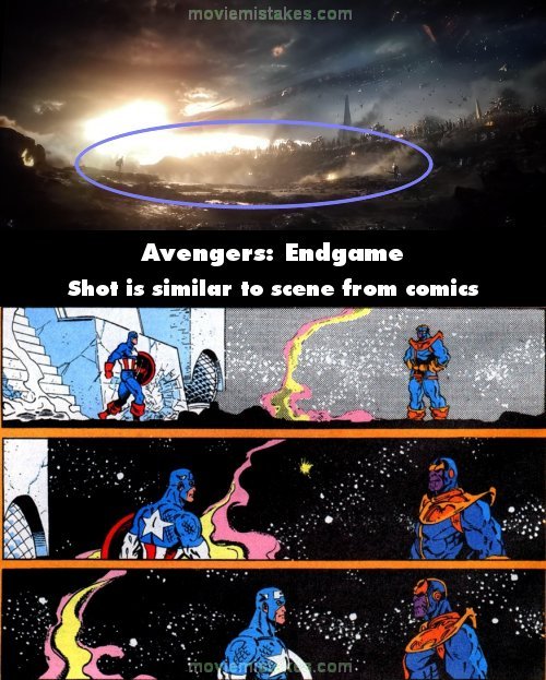 Trivia: During the climactic battle, before Doctor Strange returns with the other restored heroes, there is a wide shot of Captain America all by his lonesome walking towards Thanos. This is similar to a scene from the "Infinity Gauntlet" story, where amongst a slew of defeated heroes, Cap defiantly walks right up to Thanos and tells him he will never be able claim victory as long as at least one person stands against him.