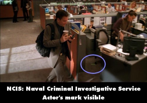 Visible crew/equipment: At the very start, as Tony walks past Ziva, a green tape marker is visible on the floor by her. (00:00:10)