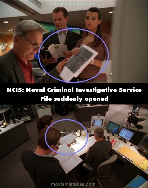 Continuity mistake: At the end, Gibbs gives Ziva a file and she takes it in one hand. Camera does an instant cut and she now has the file open in her hands and a couple of pages in. (00:38:30)