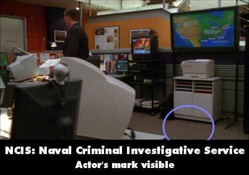 Visible crew/equipment: When McGee is trying to look at Kale's phone records, Tony walks over to him and a tape marker is visible on the floor where tony was stood. It's green by the white cabinet. (00:17:50)